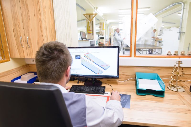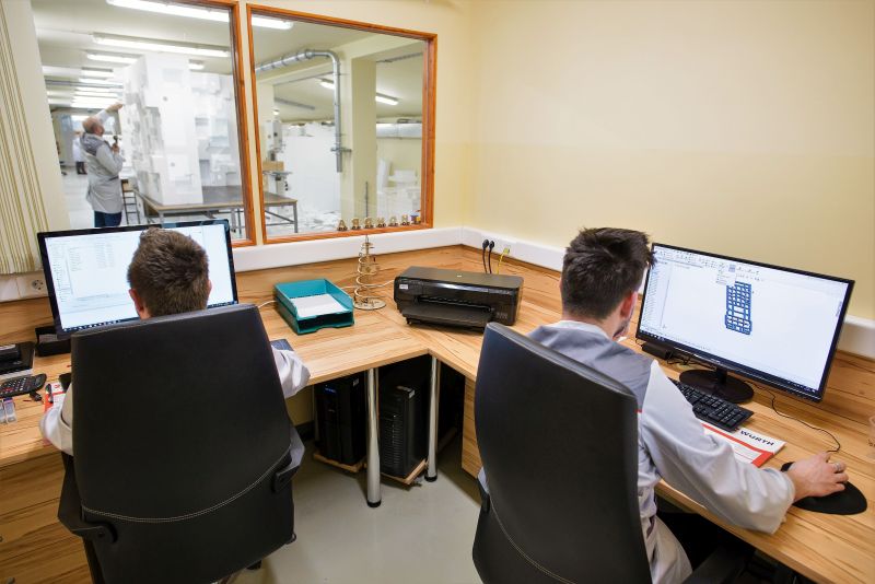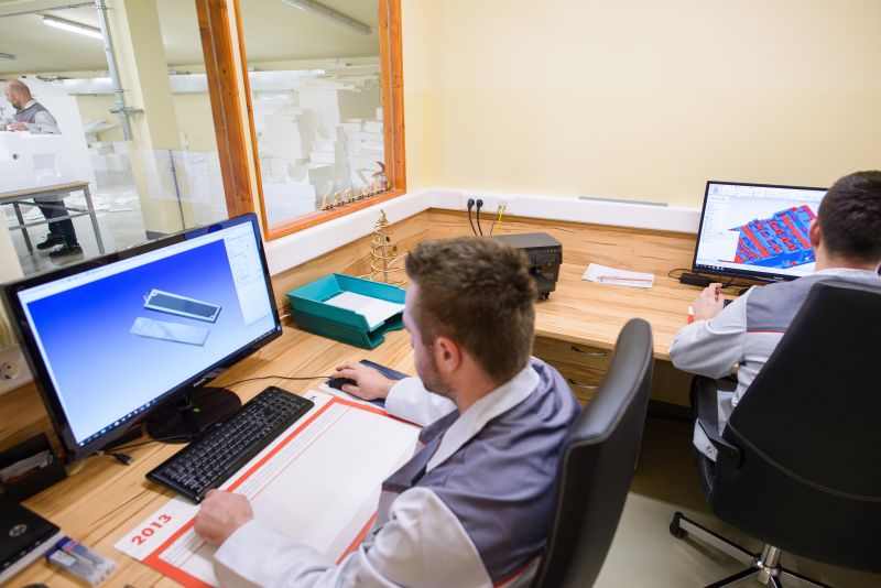 Der Prozess beginnt mit der Konstruktion von CAD-Zeichnungen, die vom Kunden geliefert oder auf Bestellung angefertigt werden. Für den Datentransfer und das Versionsmanagement nutzen wir Standard-Kommunikationskanäle wie FTP-Server sowie vorab vereinbarte interne Standards zum leichteren Verständnis spezieller Bearbeitungen oder Korrekturen während des Fertigungsprozesses.